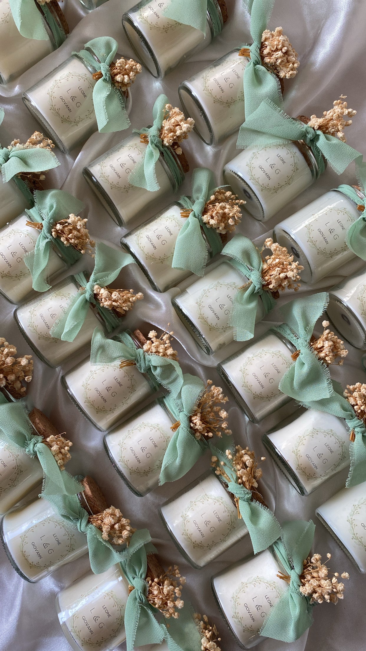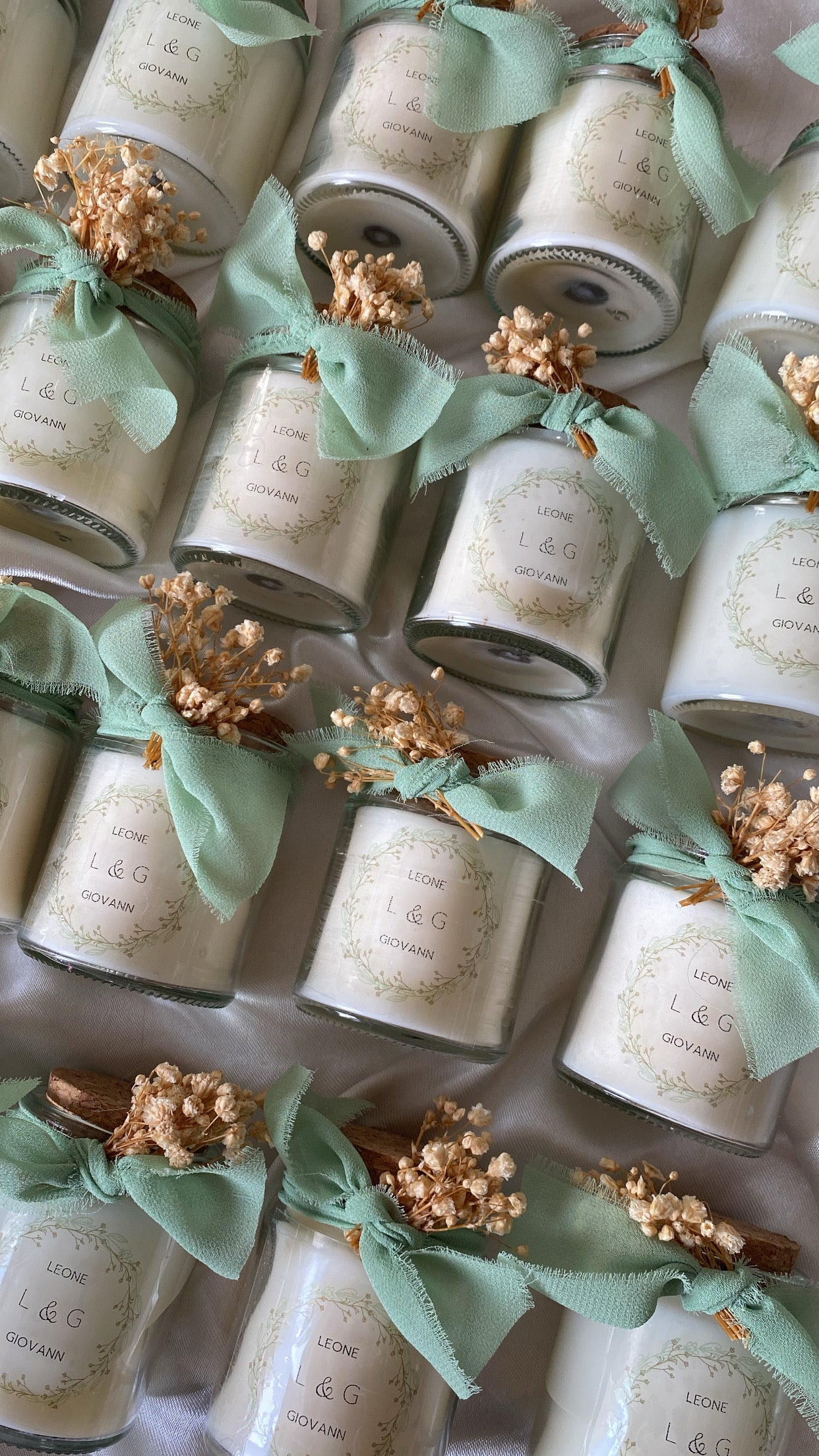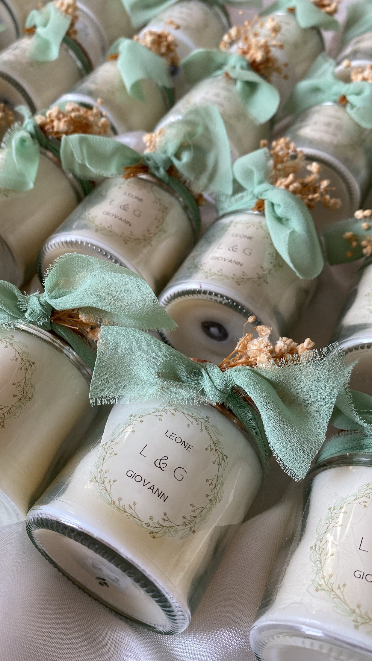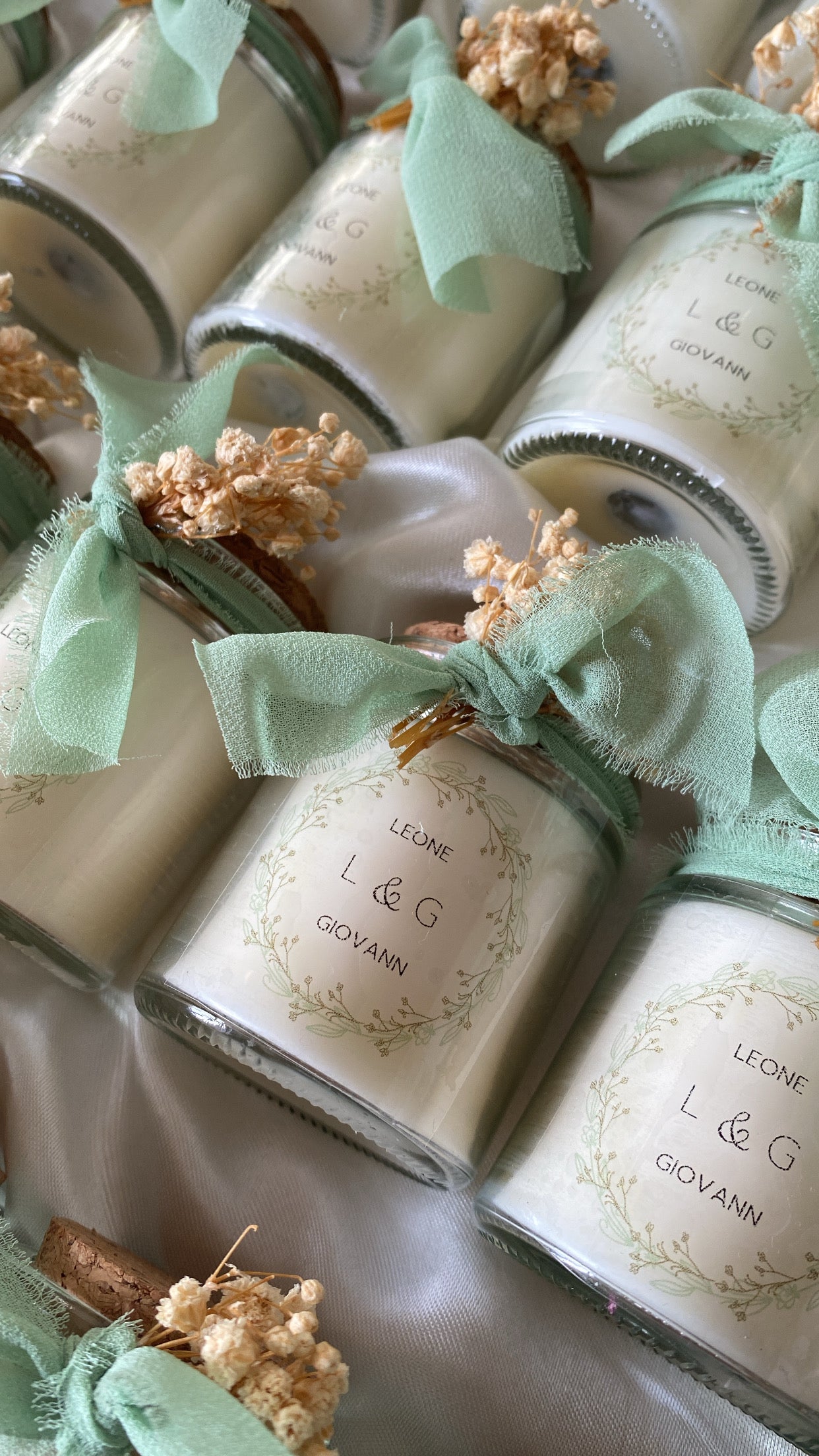 Une délicate bougie en fiole personnalisée au design délicat, nouée d’un ruban en mousseline effiloché, et de fleurs séchées.