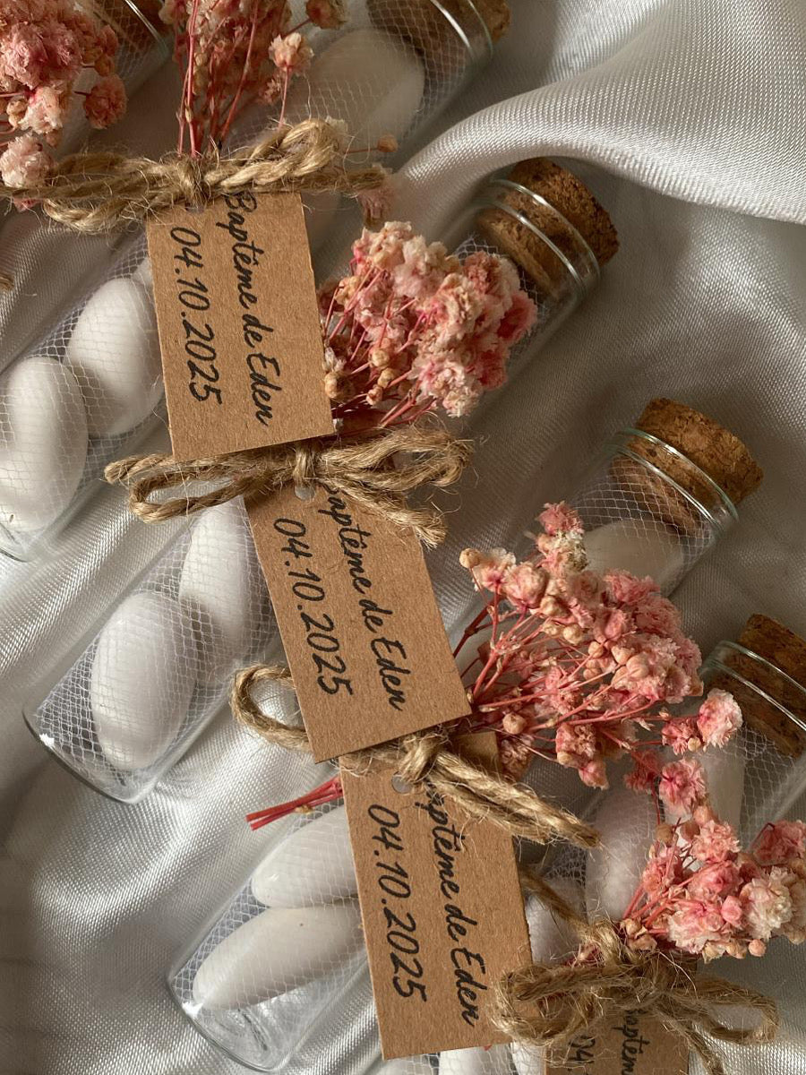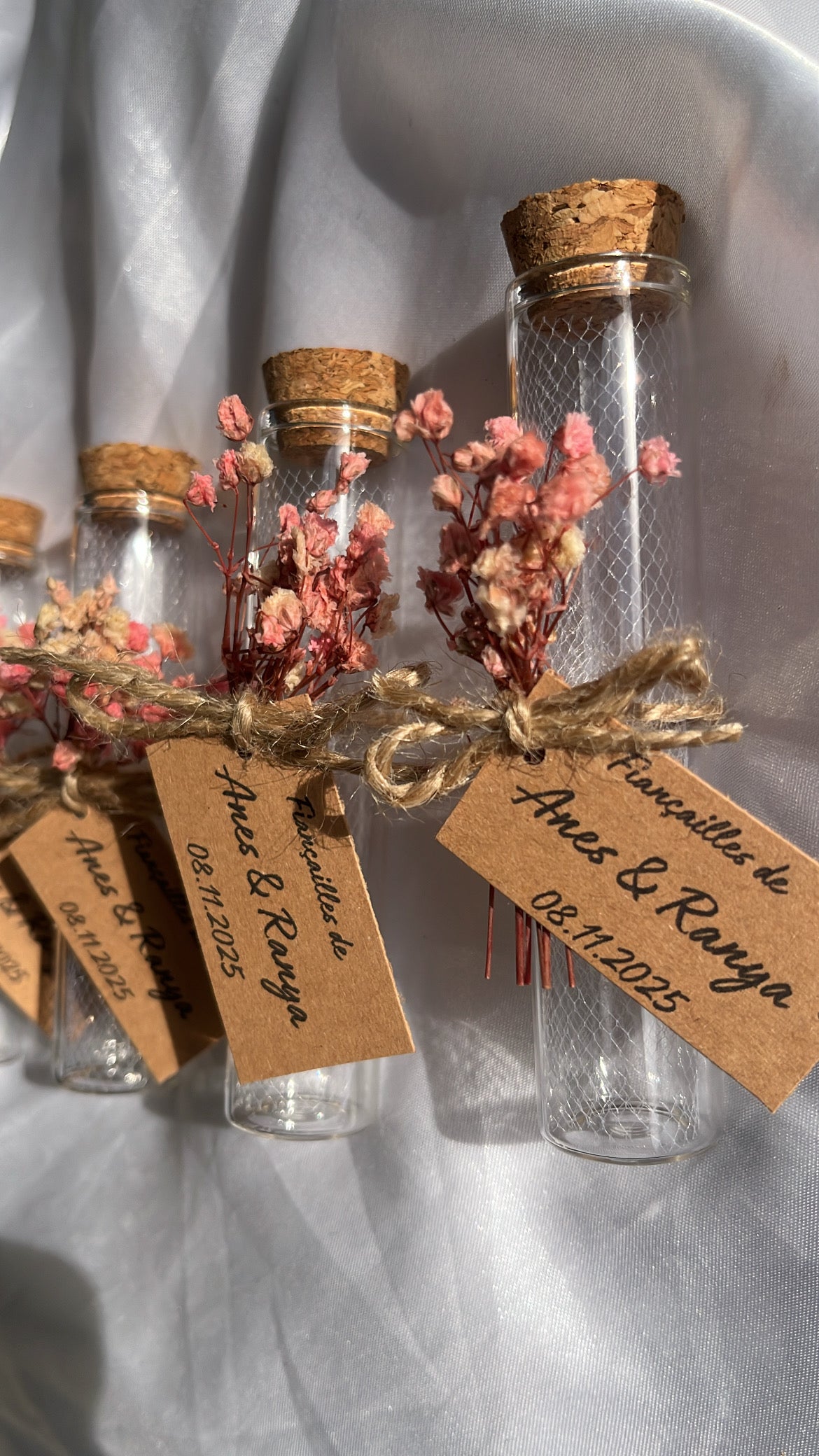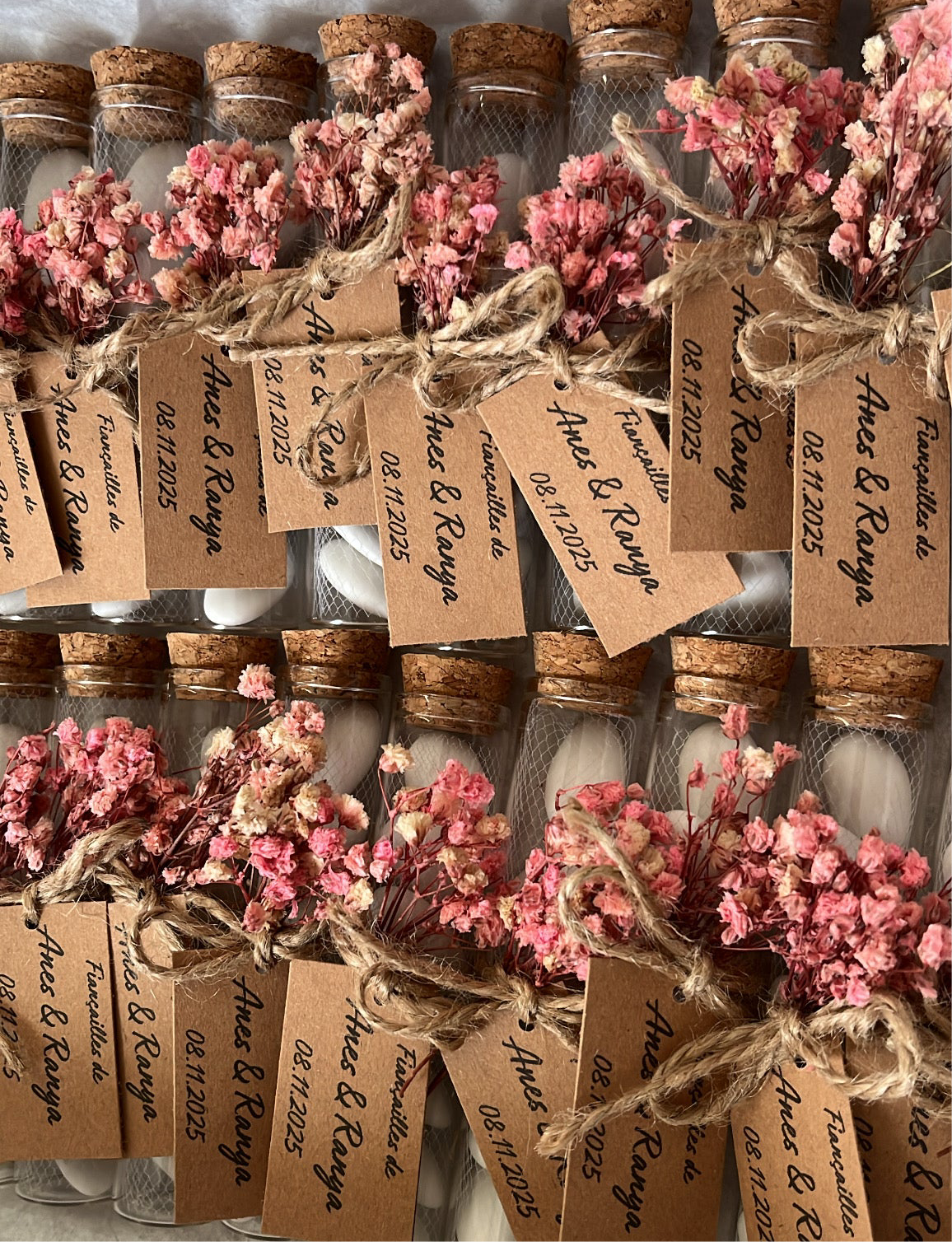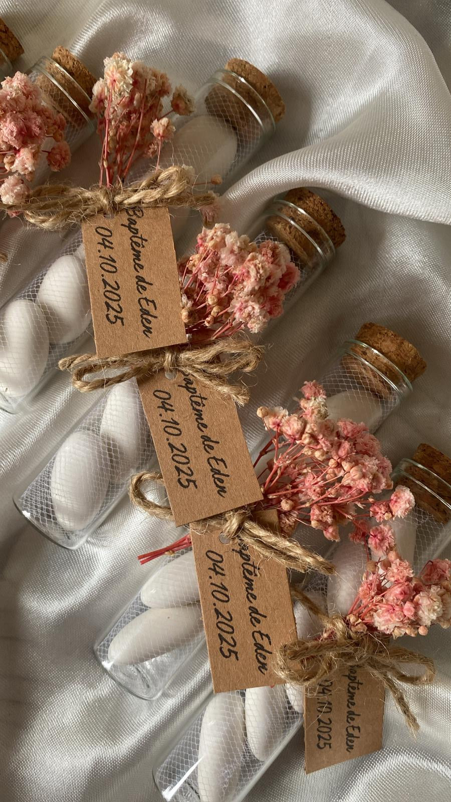 Chaque fiole est soigneusement garnie de dragées et décorée dans un esprit naturel et raffiné, avec des fleurs dont la couleur est personnalisable selon votre theme.