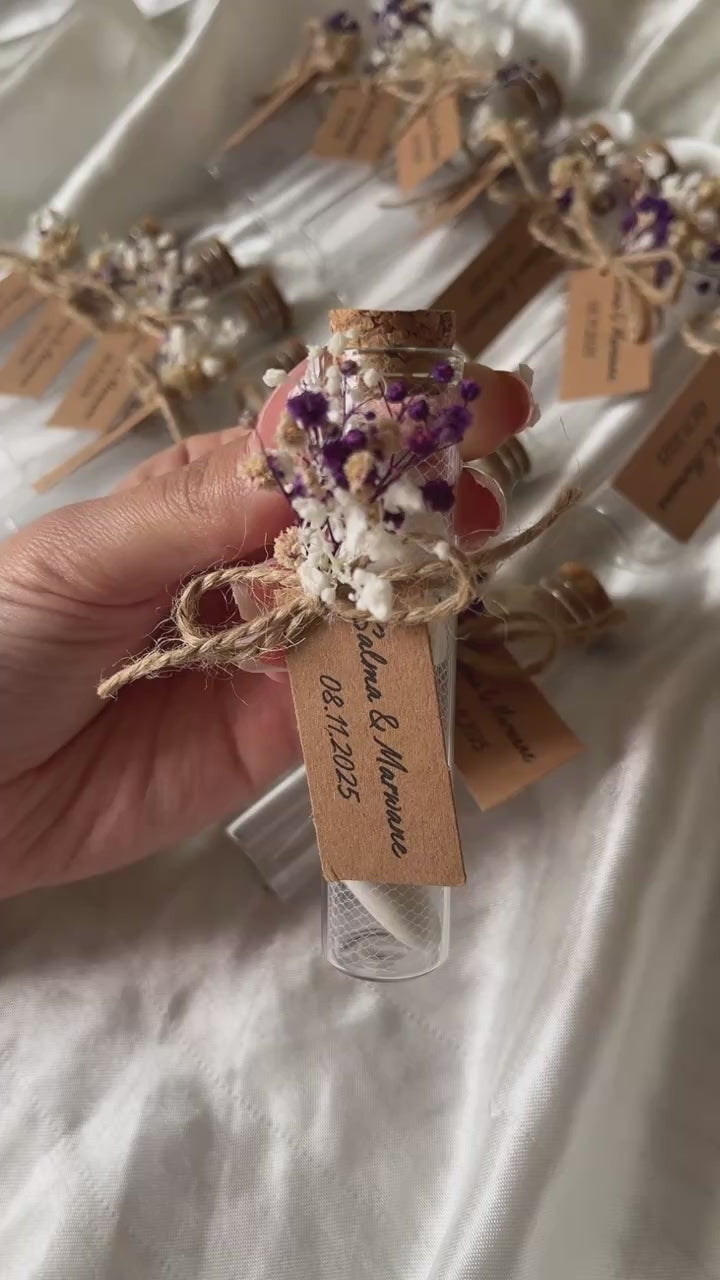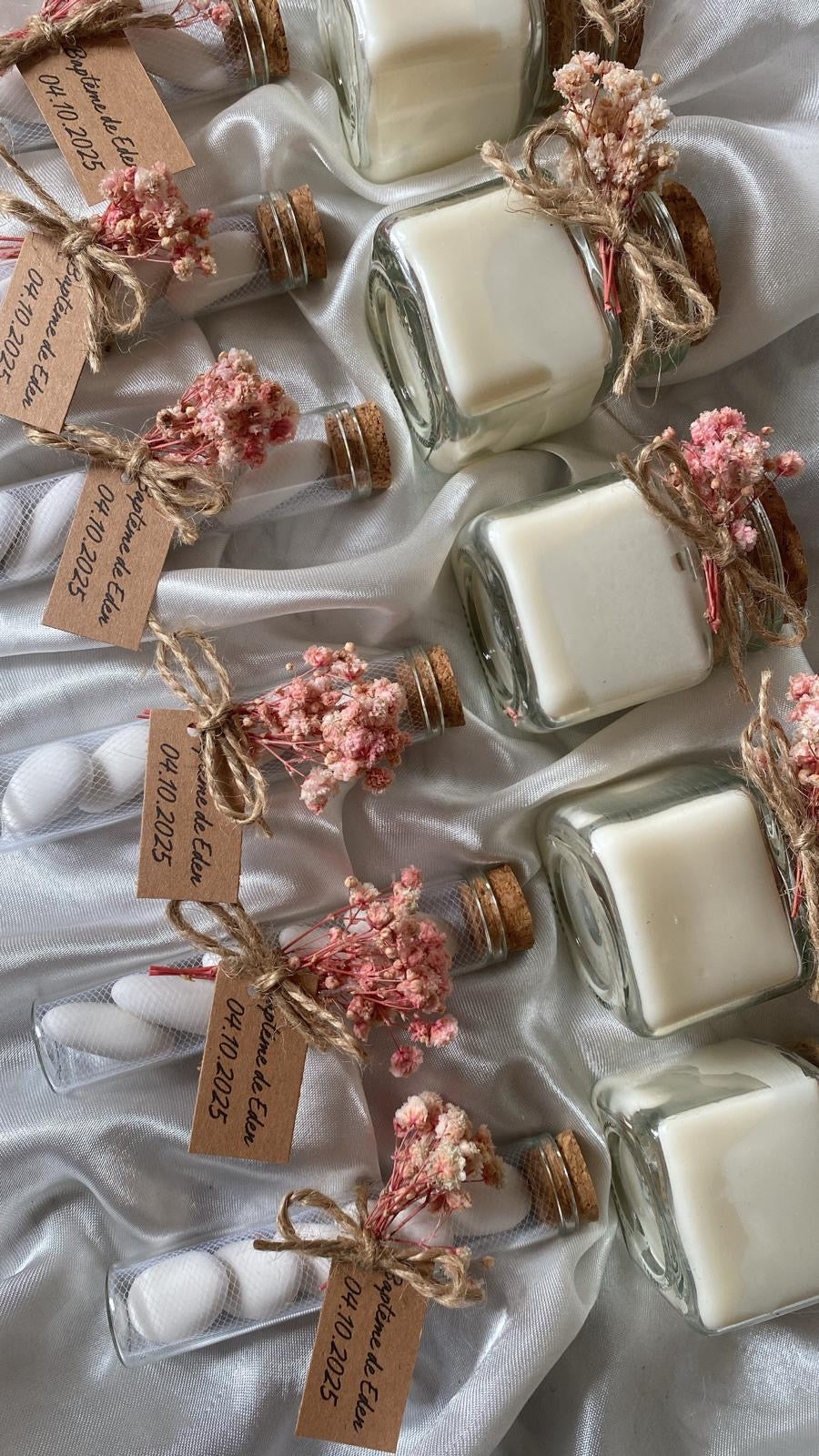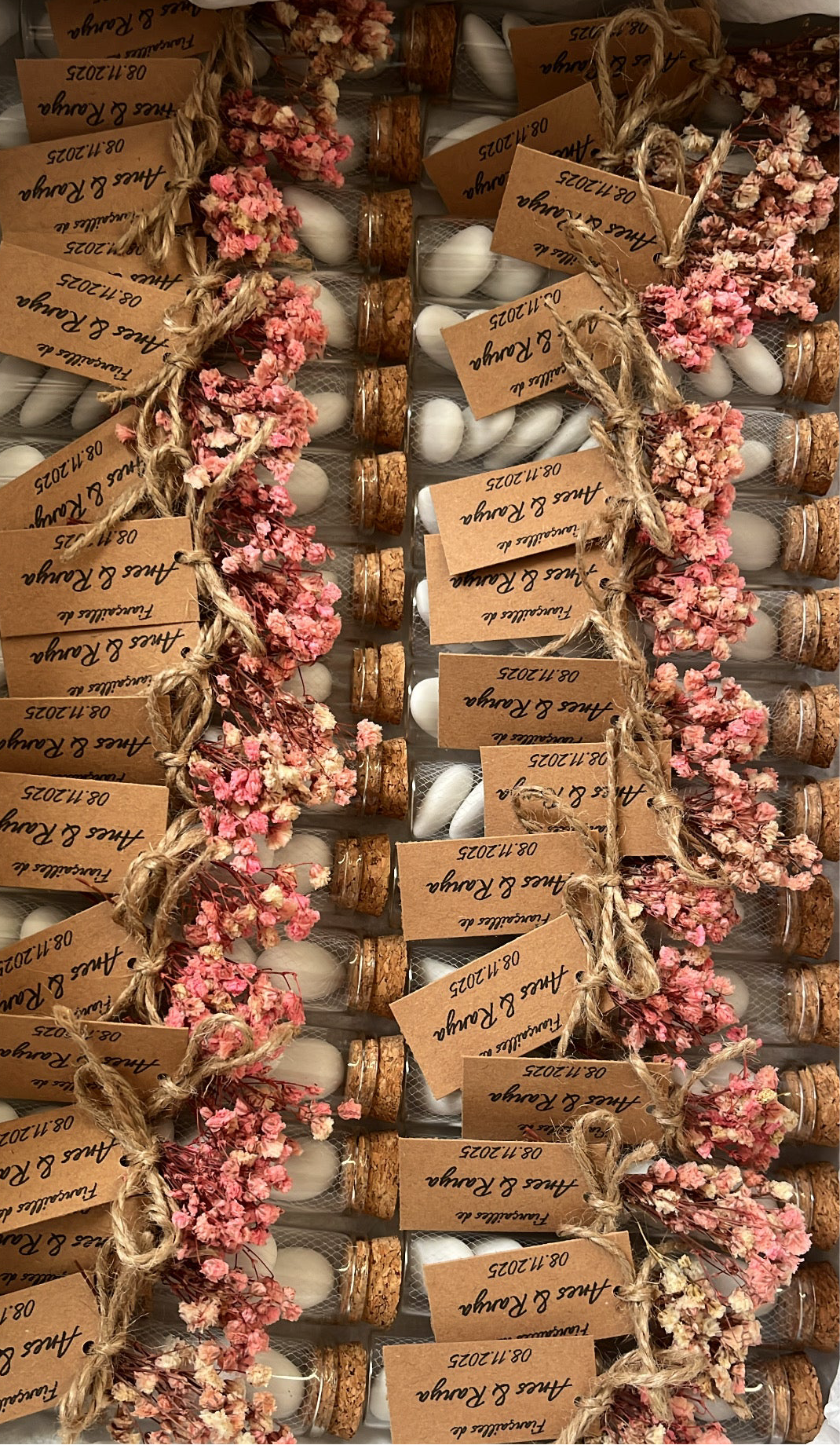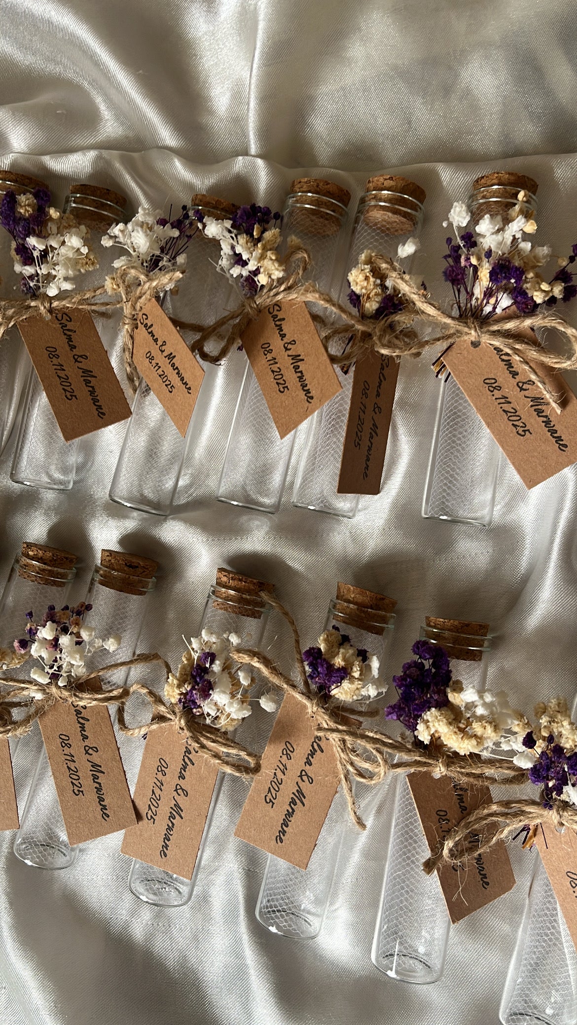 Chaque fiole est soigneusement garnie de dragées et décorée dans un esprit naturel et raffiné, avec des fleurs dont la couleur est personnalisable selon votre theme.