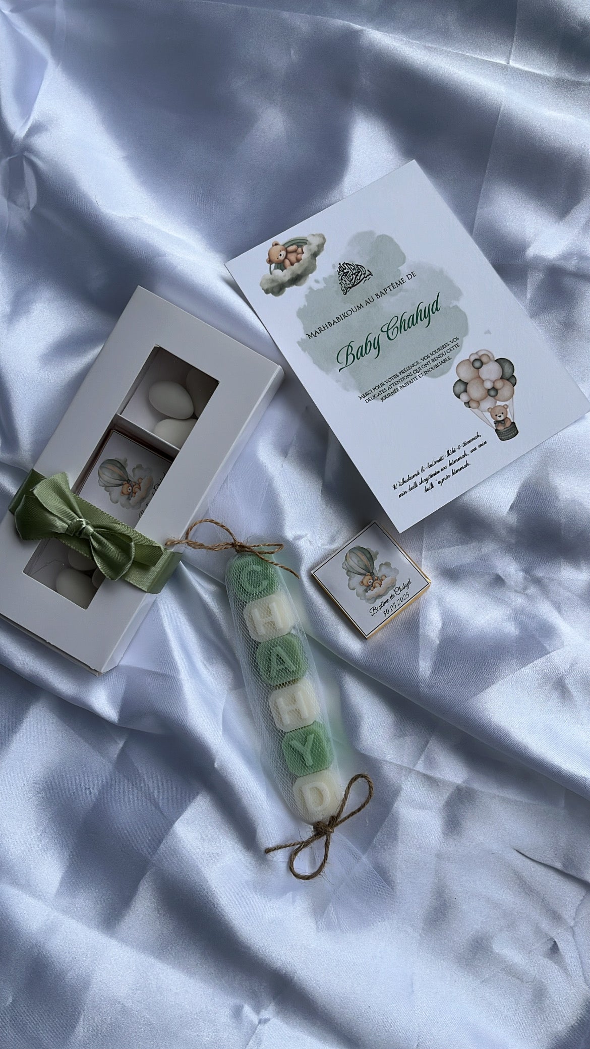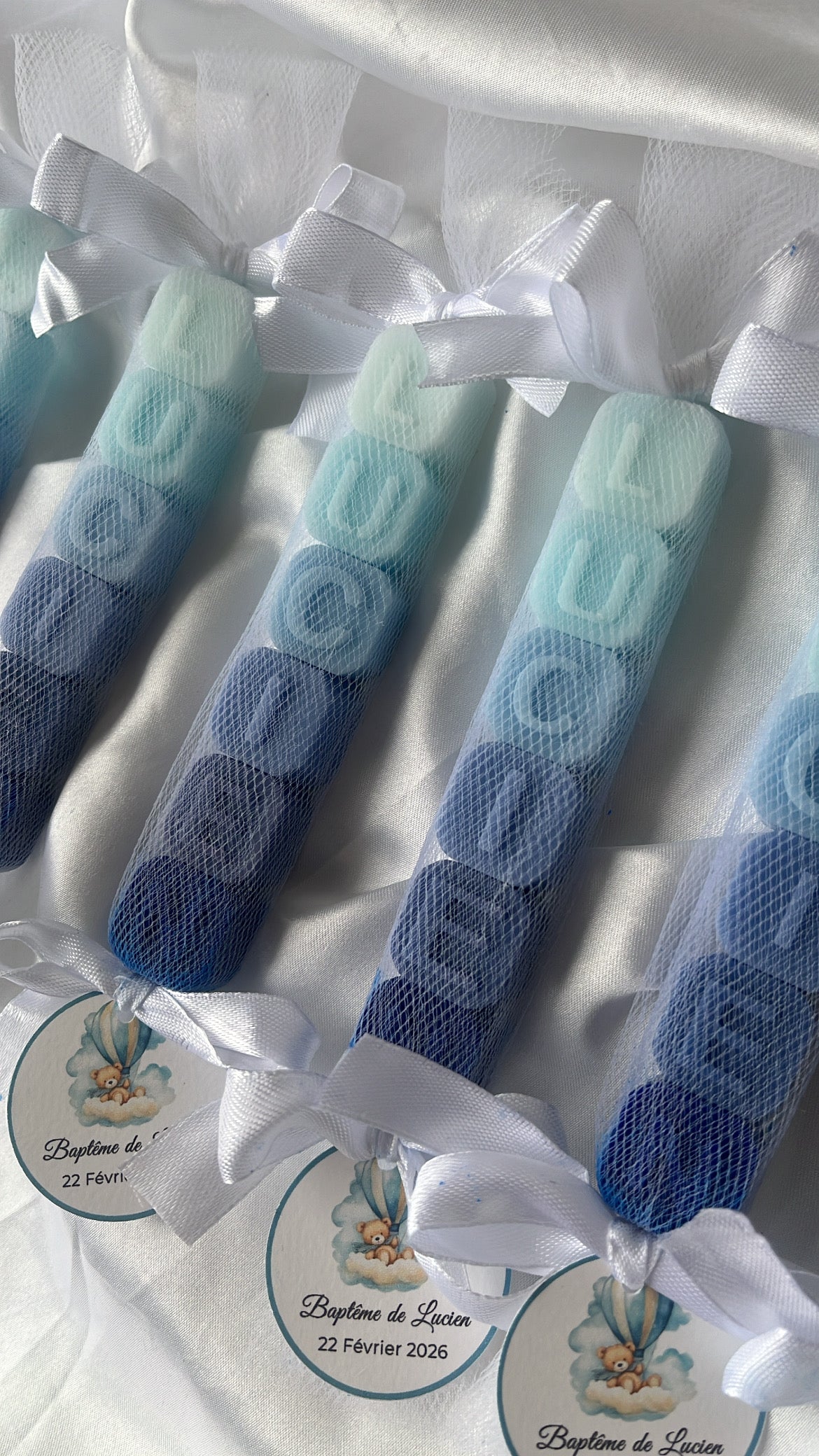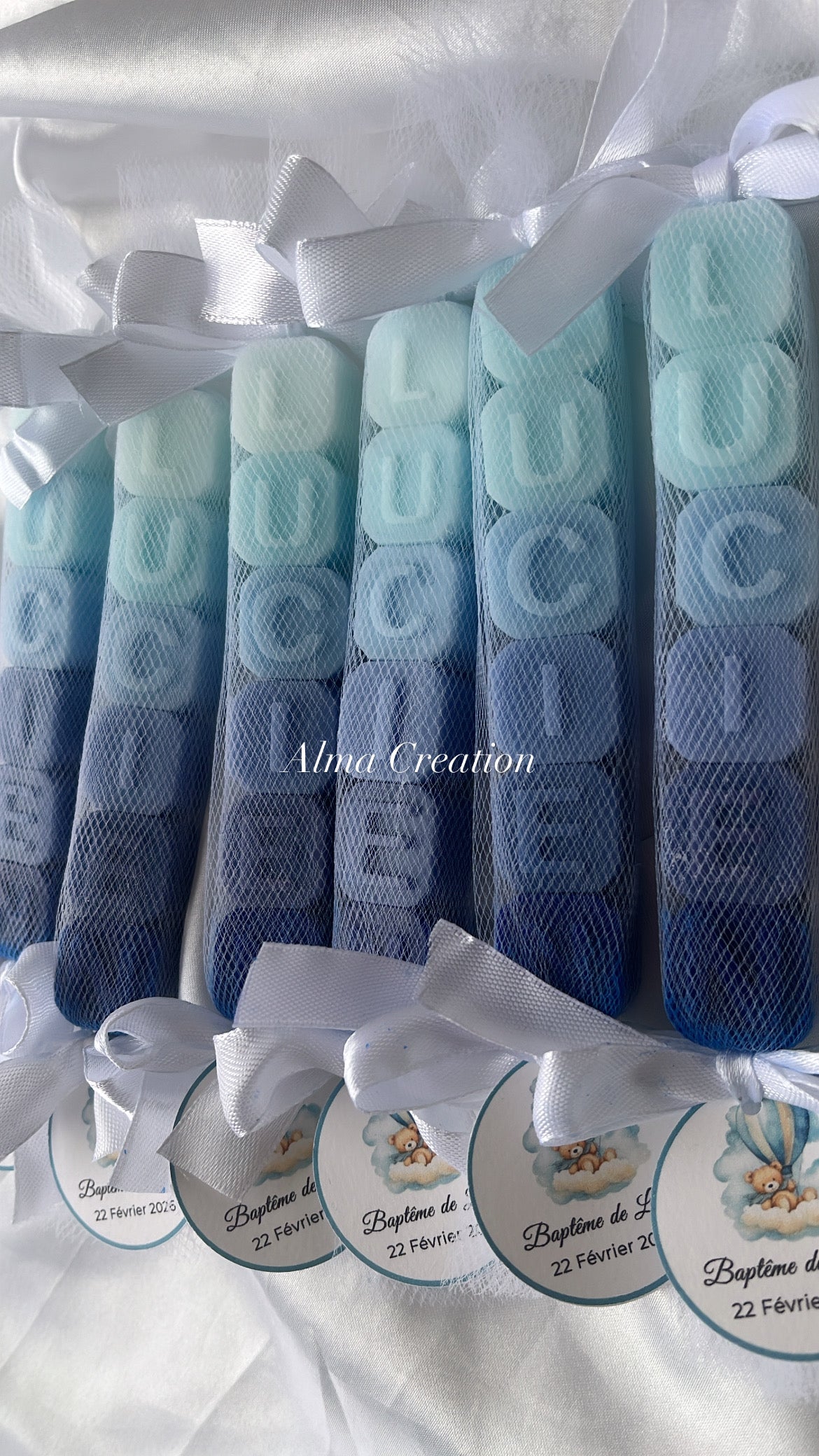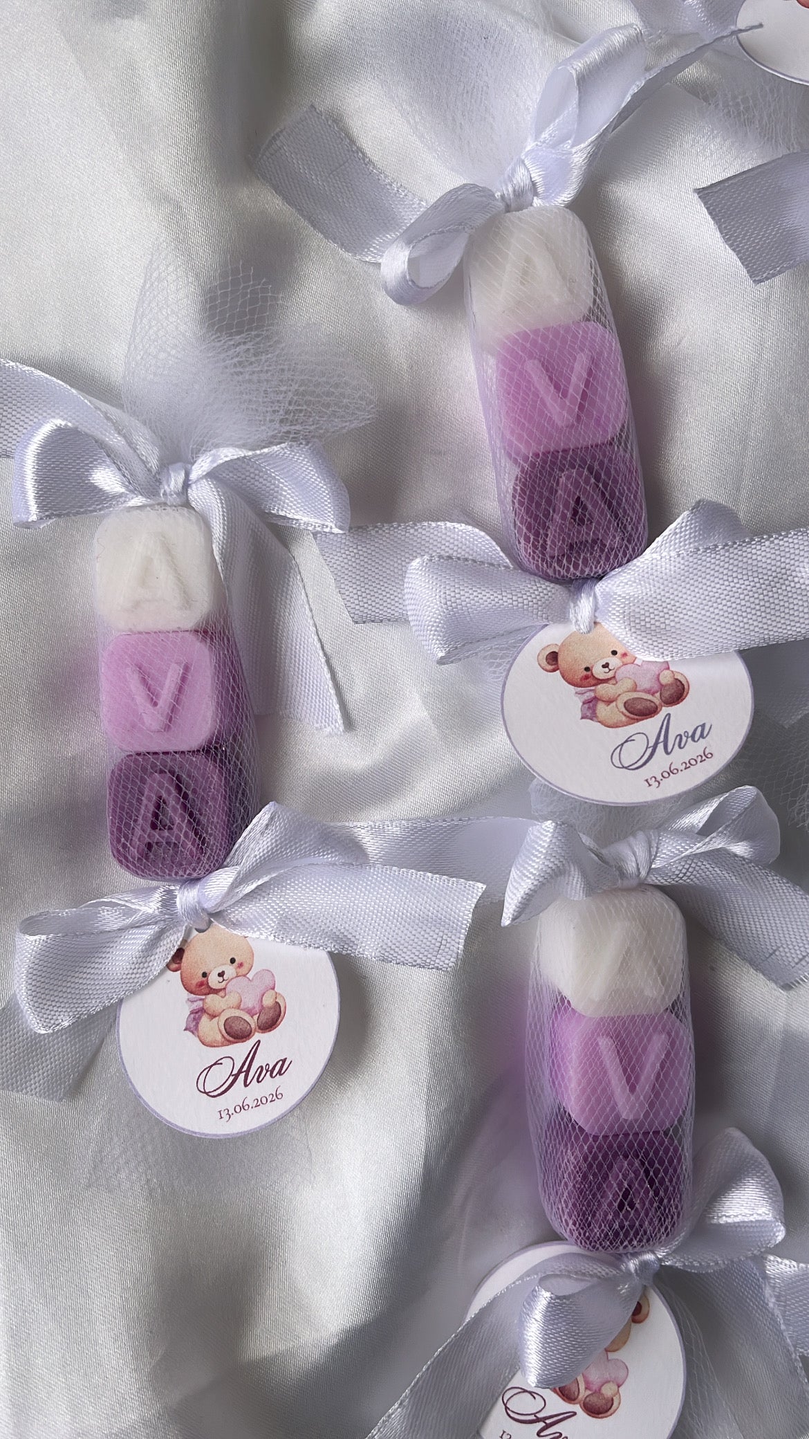 Ce ballotin de petits savons parfumés au musc blanc, emballé dans un tulle elegant, noué d’un ruban satin et accompagne d’une étiquette personnalisée au prénom de l’enfant et à la date de l’événement.