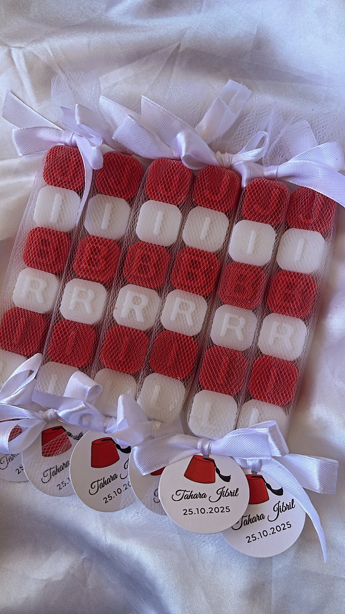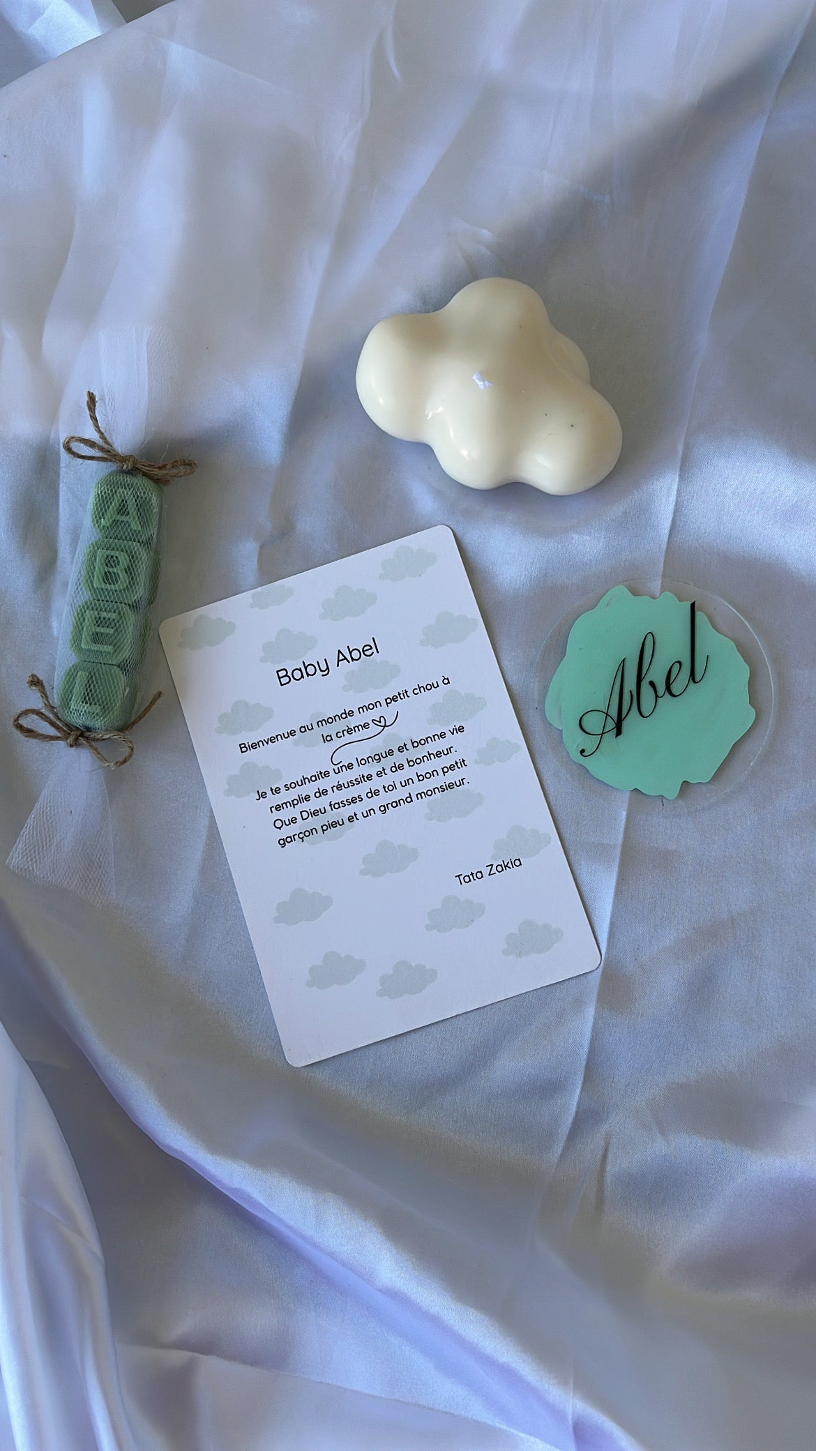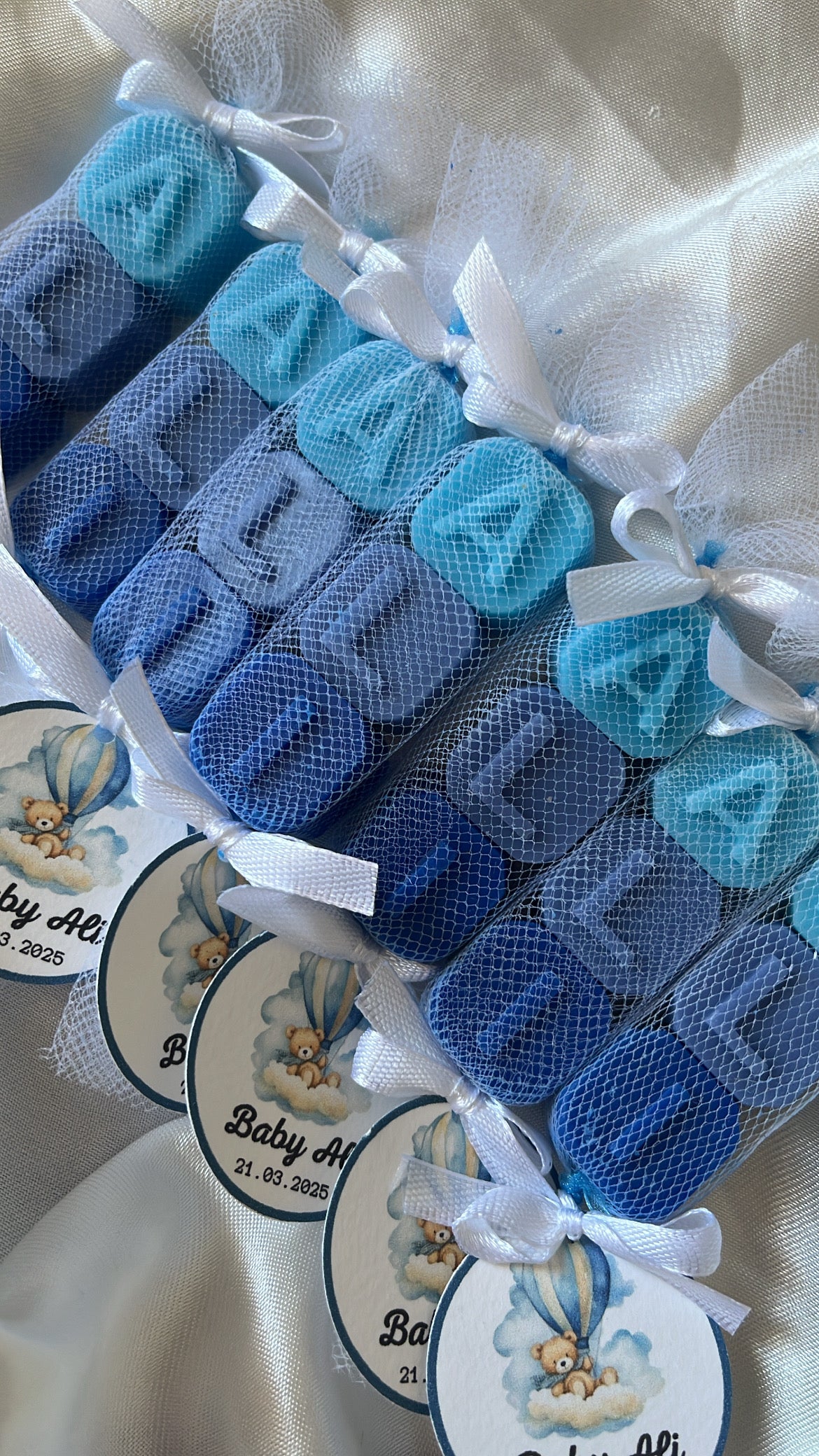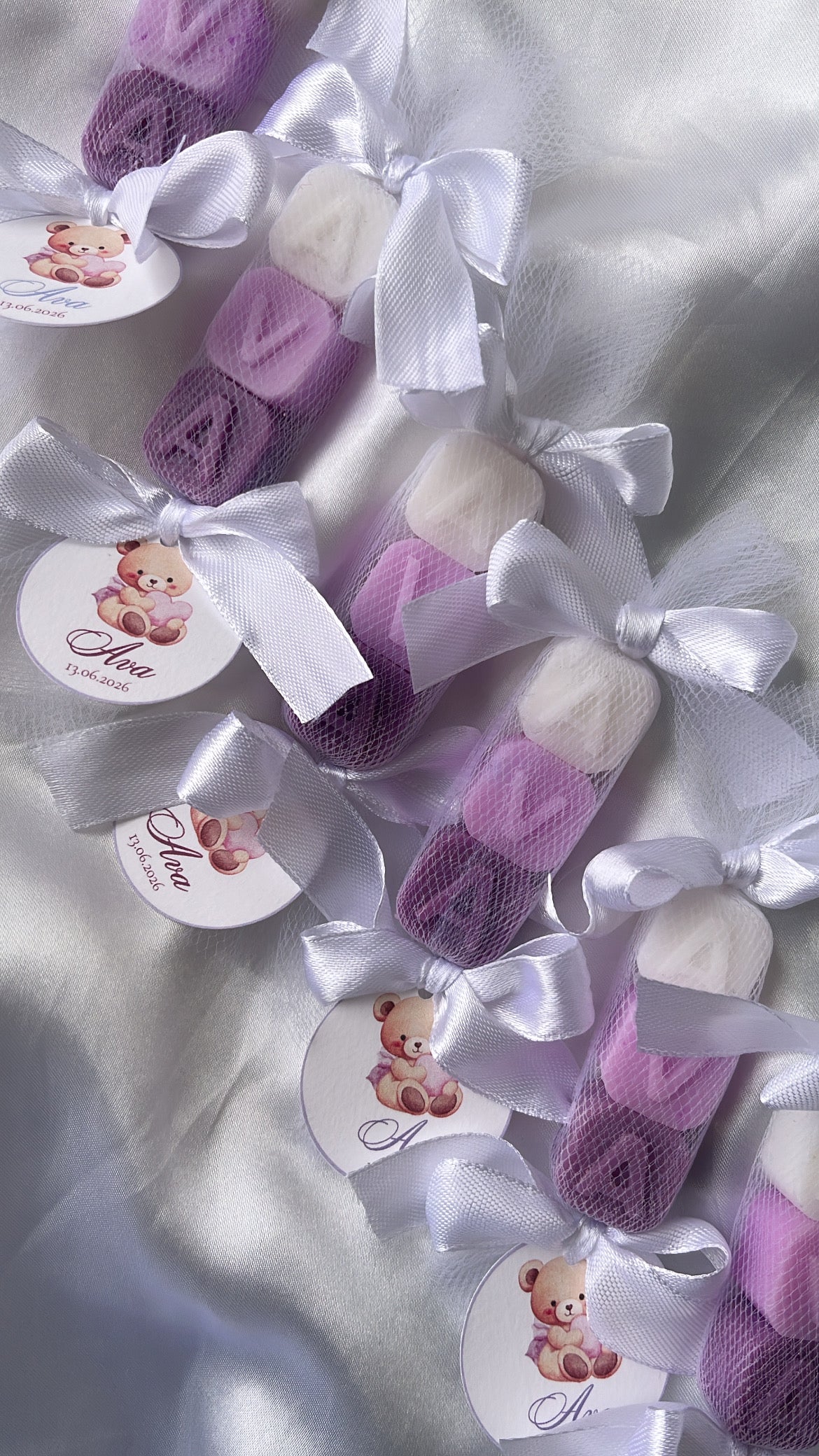 Ce ballotin de petits savons parfumés au musc blanc, emballé dans un tulle elegant, noué d’un ruban satin et accompagne d’une étiquette personnalisée au prénom de l’enfant et à la date de l’événement.